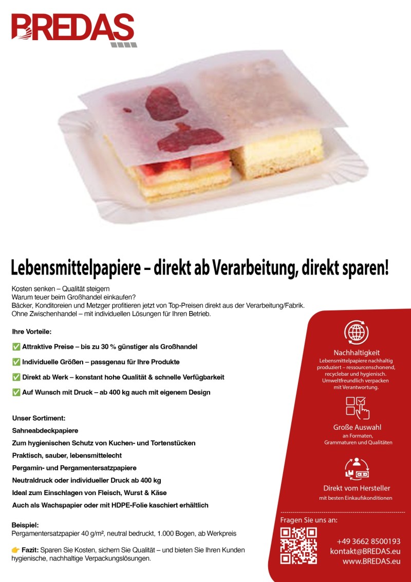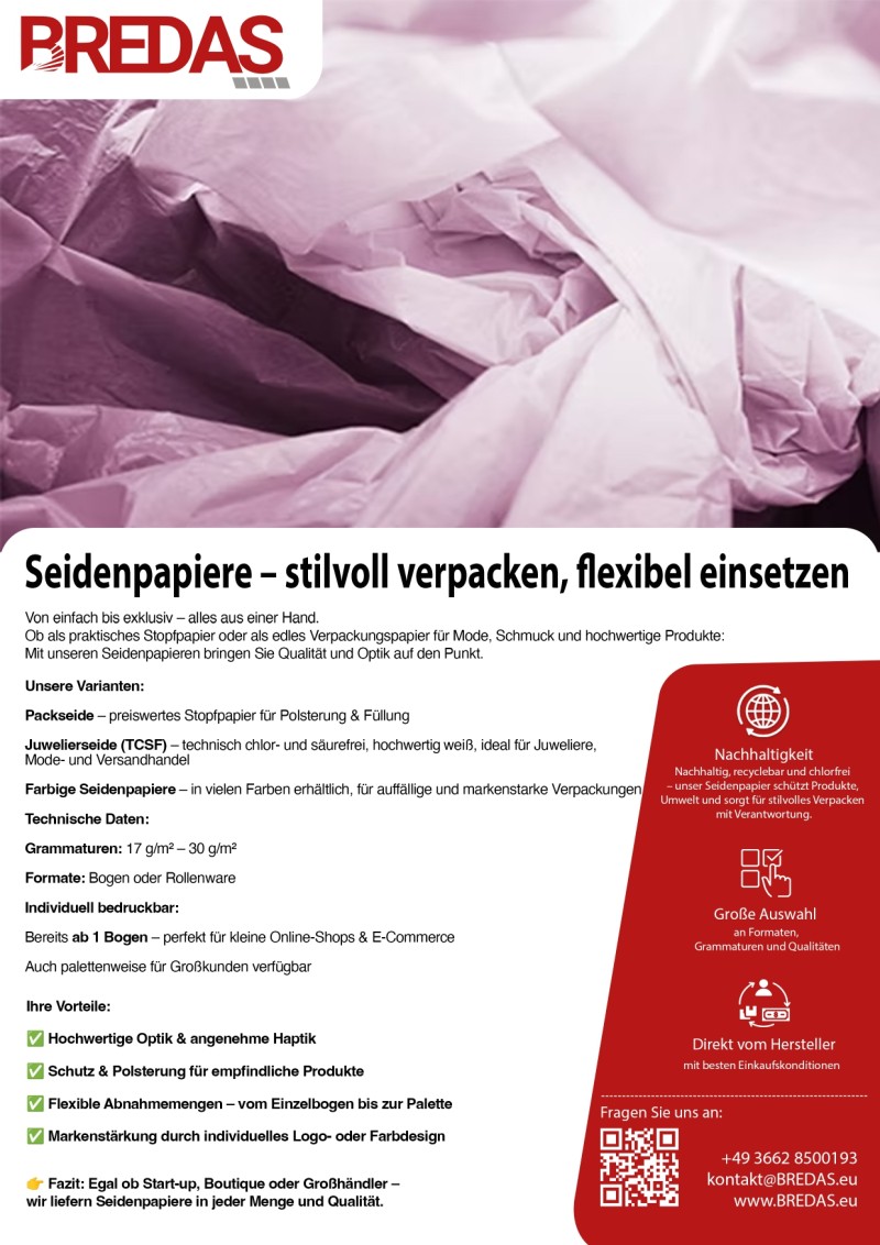 Selbiges für Seidenpapiere, Schrenzpapier, Packseide, Kraftpapier, bedruckte Klebebänder und Lebensmittelpapiere wie Sahneabdeckpapier, Bäckerseide und Pergamin.